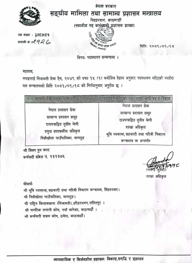 प्रमुख प्रशासकीय अधिकृतकाे सरूवा भएकाे पत्र